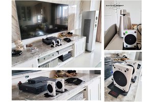 「A.I.S QM5」は部屋に設置することでオーディオシステムの効率を安定化させるアイテムだとのこと。付属の「DS-1 3D Quantum Pad PLUS」を袋ごと敷き、その上に「QM5」を立てた状態で設置する。オーディオ機器に対しては、QM5を前段上部の中央または側面に配置すると良いと説明している。