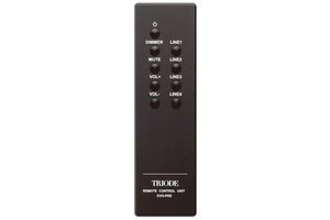 付属リモコンは重量感のあるアルミ削り出し製。電源のオン/オフ、音量調整、ミュート、入力切替、ディマーといった複数の操作を手元で行える。