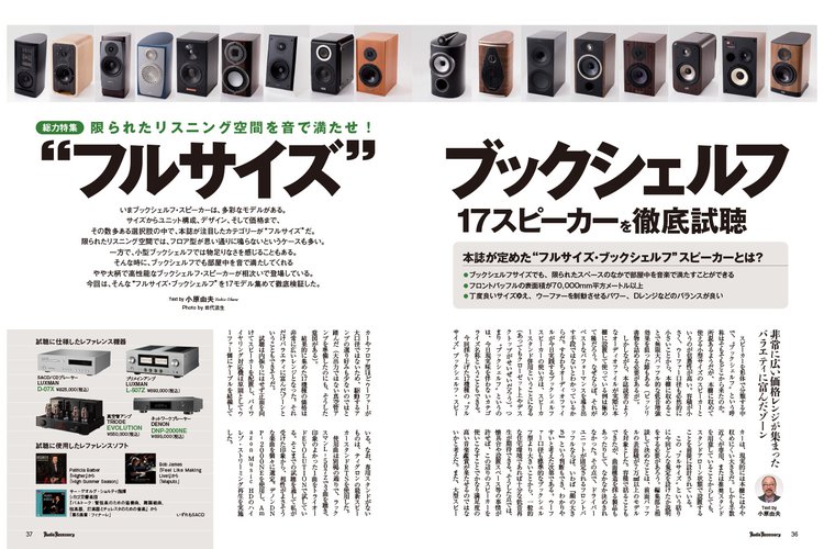 巻頭の特集「“フルサイズ”ブックシェルフ 17スピーカーを徹底試聴」では、いま充実している少し大きめのブックシェルフ・スピーカーを集め、オーディオ評論家の小原由夫氏による比較試聴が実現。37ページに及ぶ大ボリュームでお送りしています。
