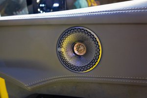 フロントのドアを開けてみると、ドア上部にKEFを象徴するUni-Q同軸ユニットが搭載されていることに驚く。グリルは装着されているが、見ればすぐにKEFだ、とわかる独特のデザイン。多くのカーオーディオではグリルで中のユニットは隠されている(あるいは保護されている)ことが多いが、エレトレではこのデザインが全面に押し出されており、KEFの音響技術に対するロータスの信頼が窺える。