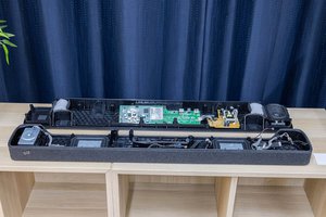 バーの中央から1/4あたりの場所に、2基のフルレンジユニットを左右対称に搭載、左右端にウーファーユニットを上向きに2基搭載。自然なステレオイメージを意図した配置のようにも見うけられる。低域の強化にはパッシブラジエーターを搭載。この構成では人の声の帯域にクロスオーバーがかからないため、「自然さ」や「聴き疲れのなさ」に繋がっていると説明する。
