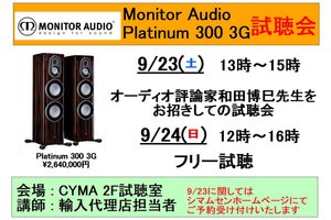 モニターオーディオの最新フラグシップスピーカーである「Platinum 300 3G」の試聴会が、9月23日(土)と24日(日)の2日間、大阪・日本橋のシマムセン別館CYMA試聴室にて開催される。