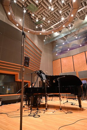 スタジオでは、朝からリハーサル、3つの楽器の収録音のバランスの調整、配信のためのテスト撮影などで慌ただしく準備を進めていた。特に、演奏者の装着するヘッドフォンから聴こえる音量バランスは、一発勝負の演奏に大変重要なので、念入りな調整が行われた。