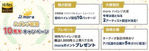 そのほか、moraでは「ハイレゾ配信10周年キャンペーン」の一環として、「大感謝ポイントプレゼント企画」も実施中。対象期間内にmoraにてハイレゾ音源を合計1,000円(税込)以上買い物すると、対象者全員にmoraポイント100ptがプレゼントされる。