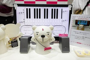 レコチョクは、「新しい音楽体験研究所」のプロジェクトとして、曲に合わせてサイリウムを振ることでサイリウムに内蔵されたセンサーが自動でイラストを生成してくれる新しい試みなどを展開。ほかにも、3Dプリンタで立体造形された「レコチョクマ」に手を近づけたり離したりすることで、テルミンのように音楽を奏でることができる「レコチョクマミン」などが体験できた。