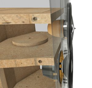 キャビネットをダンピングさせて振動成分を抑制するとともに、天然木ならではの豊かな鳴りと適度に引き締まった低域を再生するという。
