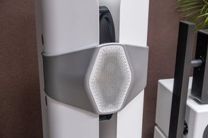 中心の六角形のユニットにはトゥイーターと、それを囲むように6基のミドルレンジドライバーを搭載。ミドルレンジは小口径だが、総面積は同社“プラチナムシリーズ”のものと同じくらいだという。縦に分割したようなキャビネットの内側には、ウーファー2基が2×2で対向配置されている。