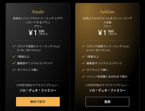 公式サイトには、月額のストリーミングサービスに加え、ダウンロードストアも用意されている。ストリーミングプランは「Studio」と「Sublime」の2つで、Sublimeではストリーミングサービスに加え、ハイレゾ音源購入を60%まで割引すると案内されている。ストリーミングサービスとデジタルダウンロードを、リスニングスタイルに合わせて切り替えて利用できるサービスになるようだ。