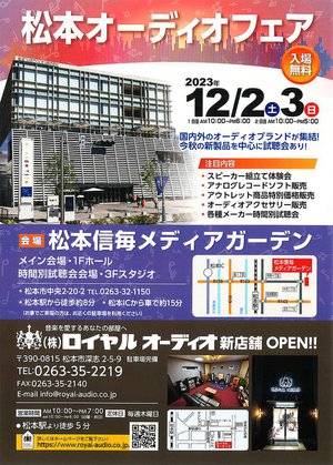 ロイヤルオーディオが主催する「松本オーディオフェア」が、2023年12月2日(土)と3日(日)の2日間、長野県松本市の松本信毎メディアガーデンにて開催される。参加無料、事前予約は不要。