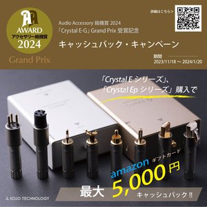 ボックス型仮想アース「Crystal E-G」が、「オーディオアクセサリー銘機賞2024」でグランプリを獲得したことを記念して行われるもの。キャンペーン期間中に対象商品を購入して応募すると、購入した商品に応じた金額がAmazonギフトカード(Eメールタイプ)でキャッシュバックされる。送付は2月下旬を予定している。