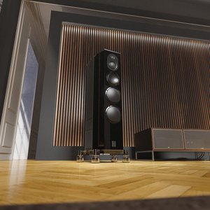 周波数レスポンスは23Hz - 40kHz、定格出力は300W、感度は89dB、インピーダンスは6Ω。サイズは3350W×1260H×460Dmm、質量は95kg。仕上げはGrey、Plum、Red、Gold、Walnut、Zebranoより選択可能で、WalnutとZebranoは追加で352,000円(税込)が必要。