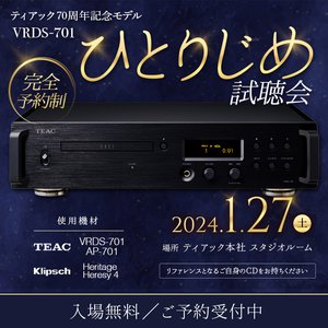 ティアックストアは、ティアック70周年記念モデルとなるCDプレーヤー「VRDS-701」を“ひとりじめ”して試聴できるイベントを、東京・多摩センターのティアック本社 スタジオルームにて2024年1月27日(土)に開催する。