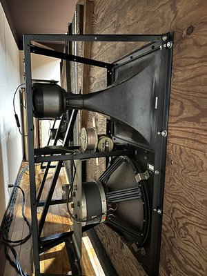 オイロダインはドイツ・シーメンス社のスピーカーで、かつては映画館などに使われていた。このスピーカーは、オーナーの中江清さんが45年ほど前にドイツから入手したもので、オイロダインの第九世代目に当たるものだという。日本国内で4枚の板を井桁に組み合わせた平面バッフルを作成し、きちんと再生できるようメンテナンスをしているという。