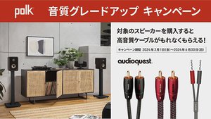 ディーアンドエムホールディングスは、Polk Audioのスピーカーシステム「Reserveシリーズ」「Signature Eliteシリーズ」の対象製品購入者全員に、AudioQuest製ケーブルをプレゼントする「音質グレードアップキャンペーン」を本日3月1日よりスタートした。