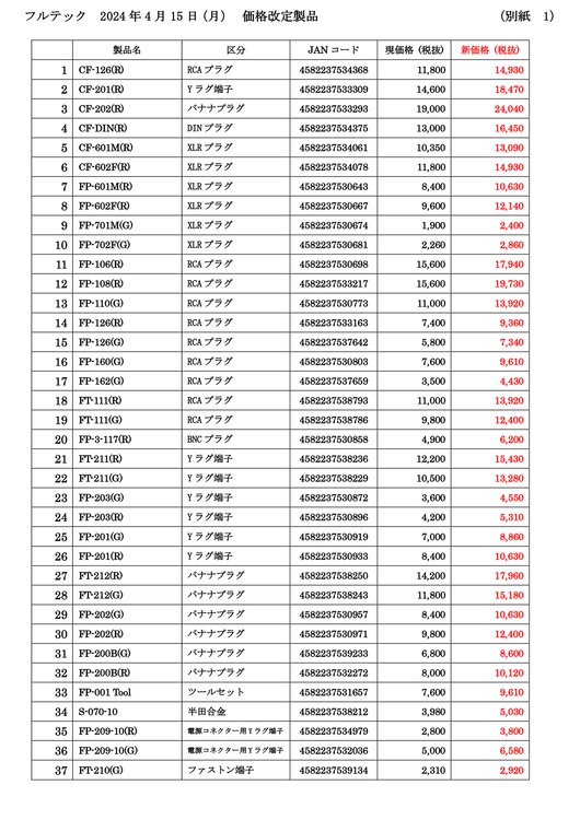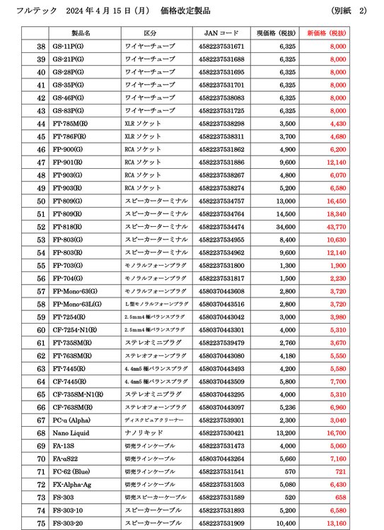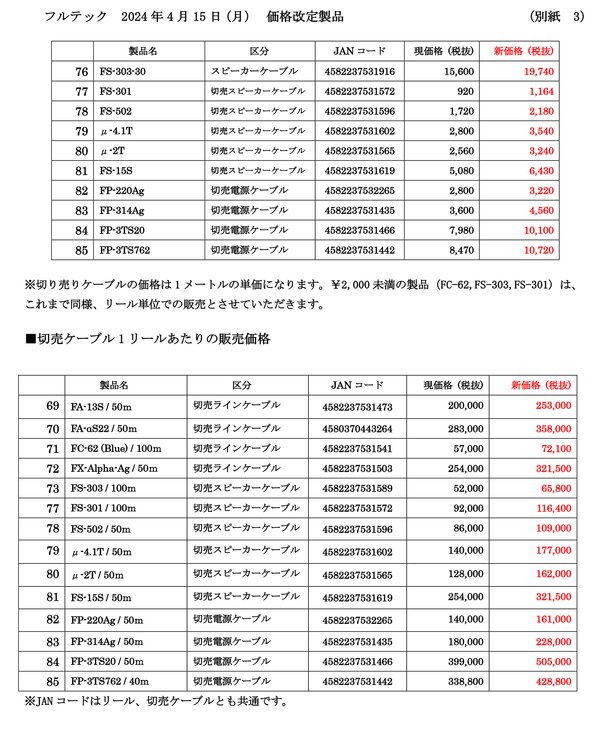 フルテック、4/15よりの値上げ製品の詳細を発表。切り売りスピーカーケーブルなど85製品が対象