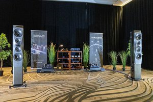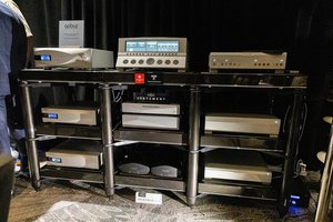 一つ目は、Wilson Audioの「Alexx V」にダン・ダゴスティーノのプリ&モノラルパワーアンプ「Rentless pre Amp」「Relentless M800」を組み合わせた超弩級システム。アナログ再生系にはクリアオーディオとDS AUDIO、デジタル再生系にはdCSを組み合わせていた。ケーブル類もTransparentで統一しており、ざっくりお値段100万ドルというシステムだ。