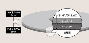 SJT-5のマグネシウム層とアルミニウム層の間とターンテーブルのプラッターとの接触面は、サンドブラスト加工がなされ、点群接触によって振動の伝達を最小化。それぞれの金属が持つ固有振動を打ち消し合うことで、色付けのない再生を狙っているという。