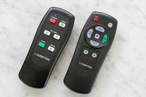 KS-55HGでは、リモコンも新しくなっており、電源/ボリューム調整/消音/入力切替/入力割当といったボタンが設置されている。外形寸法は109W×159.5H×203.4Dmm、質量はLch 約1.9kg・Rch 約2kg。
