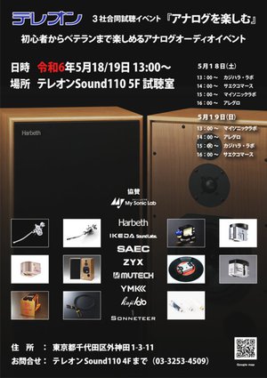 カジハラ・ラボ(IKEDA Sound Labs、MUTECH、KAJI LAB)、サエクコマース(SAEC、Harbeth)、アレグロ(ZYX、YMK、SONNETEER)の3社合同によるアナログオーディオの試聴イベントで、8つのブランドが集結。マイソニックラボが特別協賛として参加する。