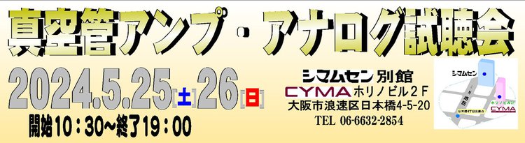 大阪・日本橋のオーディオショップ シマムセンは、5月25日(土)、26日(日)の2日間、「真空管アンプ・アナログ試聴会」を開催する。場所はシマムセン別館 CYMA2Fの試聴室。参加は無料、事前予約等も不要。