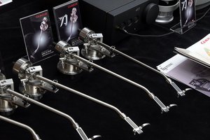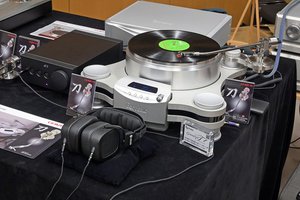 GLANZLABはトーンアームの新プレミアムモデル「MH-12 KATANA」(税込440万円)を披露。既存トーンアームと並べて比較展示するとともに、エソテリックのターンテーブル「Grandioso T1」に取り付け、HEDDのハイルドライバー搭載ヘッドホン「HEDDphone TWO」での試聴も行っていた。