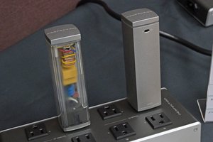 ひとつは、電源ノイズフィルターの「PFT-ANE1」。発売済みの電源タップ「PFT-T3000AF」と同様、高周波ノイズを光エネルギーに変換して除去する独自技術「ANE(アクティブノイズエリミネーター)」を搭載しており、電源タップの空きコンセント(特に上流側)に差し込むことで効果を発揮。音痩せなどの副作用を最小限に抑えつつ、電源ノイズを低減できるという。
