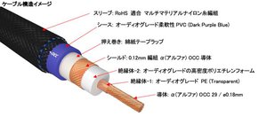 コネクタシェルには、フルテック独自のマルチマテリアルハイブリッド構造のNCF素材を採用。導体は銀コーティングを施したα-OCC導体で、絶縁体は高密度ポリエチレン。アルミニウム/マイラーホイルラップなどによる3層シールドで、アウターシースはPVC。外装スリーブは紫と黒のナイロン糸編組で、ノイズの干渉を最小限に抑え込んでいる。
