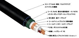 XLRモデルのコネクタは、「CF-601M NCF(R)」ならびに「CF-601F NCF(R)」。導体はα-OCC導体で、ハイグレードPEによる絶縁とPET/AIテープラップとα-OCC導体による2層シールドを採用。シースはナノセラミック&カーボンパウダーコンパウンドPVCで外装スリーブはマルチマテリアルナイロン糸編組。ケーブル外径は約13mmとなる