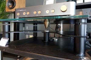 その「Magnifier」が設置されているオーディオボードも新製品。ESSECI DESIGNブランドの「AQUILIBRIUM」という製品で、磁力の反発も利用することでスパイク1点支持を実現させている。1本のスパイクでバランスし完全に水平を保つという世界初のシステムだとのことで、このスパイクから伝わった振動は5mm厚のボトムベースへ吸収・放散される仕組みだ。