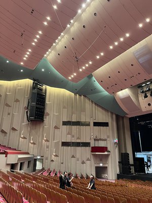 具体的には、ホール全体の空気感を捉えるため、客席中央の天井近くにゼンハイザーのマイクを「オムニクロス」と呼ばれる十字型に天吊り方式で配置。マイクにはワイドカーディオイド方式の「MKH8090」を4本採用し、空間のアンビエンスならびにVOG(Voice Of God)のために使用している。さらに左右客席上方にも同じMKH8090を4本配置している。