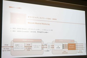 最上位モデルとして理想のサウンドを追求すべく、完全マランツオリジナルのディスクリートDAC「Marantz Musical Mastering(MMM)」の最新バージョンを搭載していることが最大のトピック。SACDプレーヤー「SA-7S1」や「SA-11S3」で使用されたオリジナルデジタルフィルターをさらに進化させたデジタル処理を請け負う前段部「MMM-stream」、DSD信号をアナログ変換する後段部「MMM-conversion」によって構成されている。
