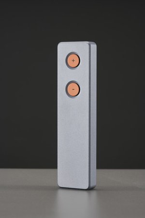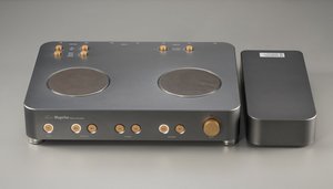 筐体は堅牢なアルミ削り出しで製造し、電源は別筐体にセパレート。外形寸法/質量は本体が435W×90H×350Dmm/15.2kgで、電源部が140W×67H×330Dmm/3.8kg。ボリューム調整が可能なリモコンが付属する。