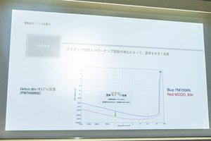 パワーアンプには、ハイスピードでS/Nが高く、低歪率だという「HDAM-SA3」を用いたフルディスクリート構成の電流帰還型増幅回路を採用。ここでもMODEL 50と同様に、フィードバックタイプのカレントソースと、ウィルソン型カレントミラー回路を採用することにより歪率を大幅に改善したとしている。既存モデルPM7000Nと比較すると、1kHzにおける歪率が67%減少しているとのこと。