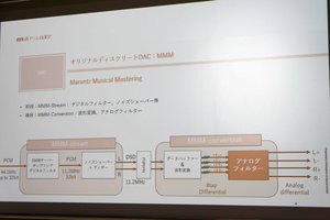 DAC部には、SACD 10で導入された、完全マランツオリジナルのディスクリートDAC「Marantz Musical Mastering(MMM)」の最新バージョンを搭載。デジタル処理を請け負う前段部「MMM-Stream」、DSD信号をアナログ変換する後段部「MMM-Conversion」によって構成されている。
