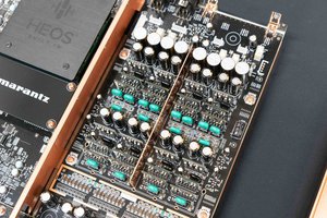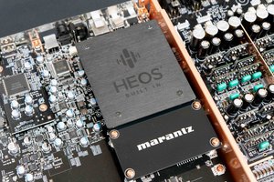 回路内のパーツでカバーに「HEOS」と書かれている部分が、新たに導入されたネットワーク回路部分。また、アナログ基板とデジタル基板の干渉を防ぎ、ノイズ発生を抑えるためにシールドも追加されている。