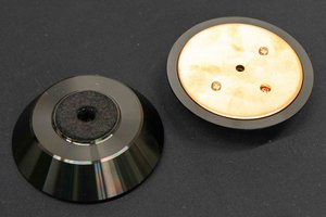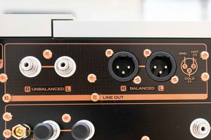 RCA端子には純銅削り出しのピンジャックとスピーカーターミナル(SPKT-100+)を採用。純銅削り出しは、一般的な真鍮と比較して柔らかく、機械加工が難しいため、熟練工が純銅のブロックからひとつひとつ手作業で切削加工して生産している。銅は高い電気導電性を持つため、力強さと安定感のある再生音を可能とする。表面処理は厚みのある1層のニッケルメッキが使用された。