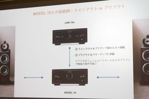 具体的な接続例について、LINK 10nと外部アンプを接続する時は、2V固定のラインアウト出力からの信号を外部プリアンプに接続して使用するシーンをはじめ、LINK 10nのプリアウトをパワーアンプ/モノラルパワーアンプに接続する場合、MODEL 10と組み合わせる際はLINK 10nのラインアウトからプリアンプ部の入力に接続するケース、またプリアウトからパワーアンプに直結させる接続方法がある。プリアウト出力から接続した場合は、コントロールアプリを使用して音量調整が可能だ。
