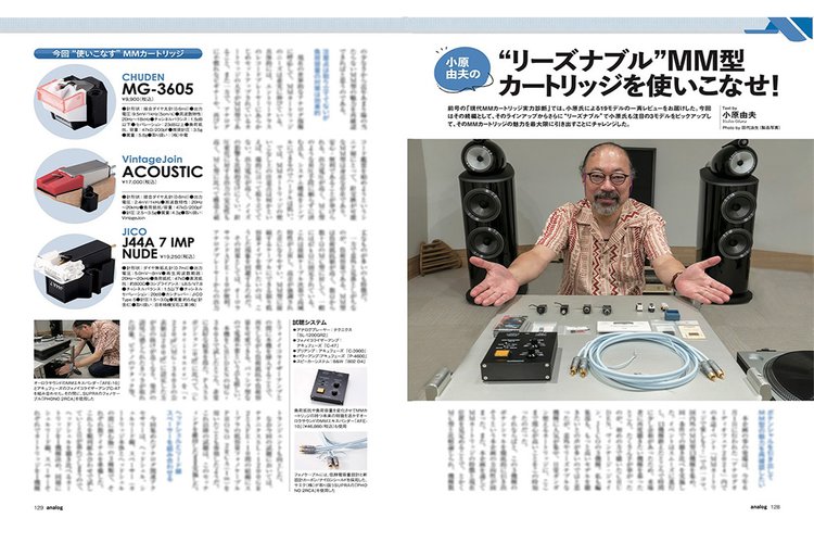今号は「レコード再生の制振」を大特集していますが、“使いこなし”の記事も充実しています。オーディオ評論家の小原由夫氏が、いま注目するMMカートリッジ3モデルに、さまざまなアクセサリーを駆使して、各モデルが持つ魅力を最大限に引き出す企画を掲載しています。