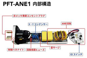 ノイズ除去の中核技術として、電源タップ「PFT-T3000AF」と同等のアクティブノイズエリミネーター(ANE)回路を搭載。スイッチング電源のノイズなど、電源ラインに重畳する数百kHz帯域の高周波ノイズを抽出し、電圧変換。そのエネルギーで本体のアクリル内部に装備されたLEDランプを点滅させることで、ノイズ除去を行う。