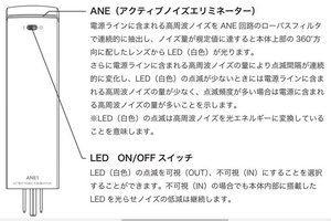 LEDランプの点滅の頻度によって高周波ノイズ量を目視で確認することができ、また点滅する光はスイッチによって消灯が可能。消灯状態でも筐体内部では発光が行われるため、ノイズ除去機能は継続されるという。