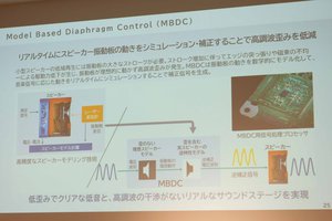 スピーカー振動板の動きをリアルタイムにシミュレーションし、併せて補正することで高調波歪み最大限に低減する「Model Based Diaphragm Control(MBDC)」を採用する。スピーカーの構造上、ボイスコイルから遠ざかるユニットのエッジ部分では十分な駆動が得られず、ダンパーとエッジの変位が生じることで高調波歪みが発生し、各楽器の音の分離感などに悪影響を与えてしまう。