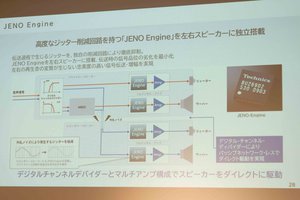 高度なジッター削減回路をもつ「JENO Engine」を左右スピーカーのアンプに独立で搭載しており、デジタルチャンネルデバイダーとマルチアンプ構成とすることでスピーカーをダイレクトに駆動。伝送時の信号品位の劣化を最小化し、また左右の再生音の変質が生じない忠実度の高い信号伝送・信号増幅を実現している。