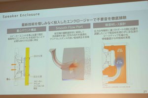 スピーカーユニットを重心位置で固定して駆動時のユニットのブレを低減する「重心マウント向上」をはじめ、フロント側に配置されたバスレフポートには流体解析によって空気の流れの最適化する「Smooth Flow Port」などを導入。また再生音の躍動感を損なわないために「吸音レス設計」が採用されている。圧力分布解析に基づいて、バスレフポートの内部開口位置を細かく調整しているため、吸音材を使用しなくとも定在波によるピーク/ディップを最小化しているという。