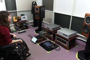 新横浜にあるロームの試聴室にて、最新のDACチップの音を体験させてもらった。スピーカーはTADのブックシェルフスピーカー「TAD-CE1TX」を使用、パイオニアのCDプレーヤーからデジタル出力した音源を、ローム製のDAコンバーターの「評価ボード」に入力し、評価ボード上のDACチップを差し替える形で比較試聴を行った。