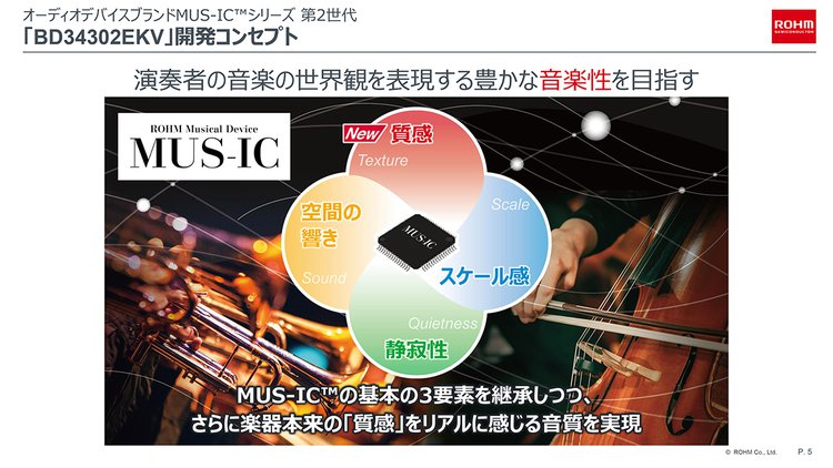 ローム(株)は、同社が展開する高音質ICのフラグシップ “MUS-ICシリーズ” から、第2世代のオーディオDACチップとなる「BD34302EKV」を発売する。2018年に発売された「BD34301EKV」の後継機となる。