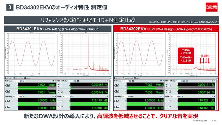 本機の開発においては、新たにDA変換時におけるDWA(Data Weighted Averaging)アルゴリズムを再設計し、THD+N特性を-117dBに改善(BD34301EKVでは-115dB)。DWAは、複数のスイッチ素子を動作させてアナログ変換を行う際、素子のミスマッチを平準化することでオーディオ特性を向上させる技術のことで、特性グラフを見ると特に偶数次高調波歪みの低減を実現している。SN比については前モデルと同様130dB。