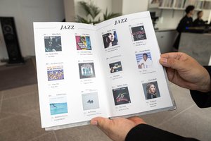 入り口に近い側にはコーヒーや軽食などを出してくれるカウンターとDJブース、奥には本格オーディオシステムを設置。「オーディオアドバイザー」としてオーディオに詳しい専門スタッフが常駐し、レコードを中心にさまざまな音楽を楽しませてくれる。カフェメニューのような “アルバムメニュー” も用意されており、リクエストも可能。開放的な空間で、音を全身で浴びるように体験することができる。