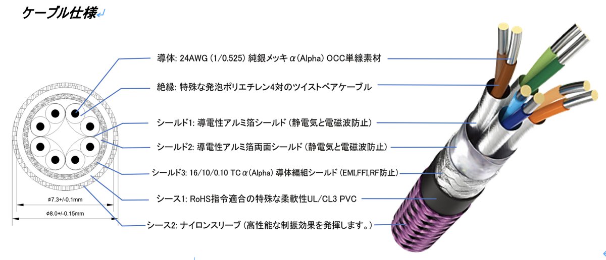 メイン導体には純銀メッキのα-OCC単線素材を採用。発泡ポリエチレン絶縁と綿密な三重シールドでノイズを効果的に隔離している。またシースは柔軟性PVCとナイロンスリーブにより、内部の共振防止も図られている。