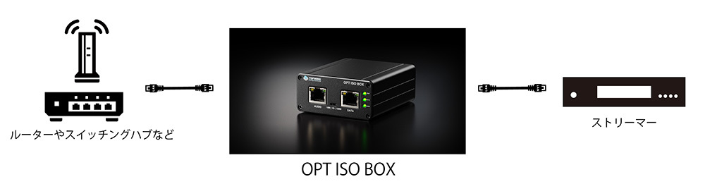 スイッチングハブやルーターから、LANを経由してネットワークオーディオ機器に伝播するノイズを、電気信号から光信号への変換を利用して除去するためのオーディオアクセサリー。