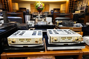 フォノイコライザーはスイス・HSEの「Masterline 7」に、プリアンプは「Masterline 8」、日本でもなかなかお目にかかれない垂涎のハイエンドシステムである。ちなみにパワーアンプは、リンさん自身が設計したという自社ブランドの「LEGATO」。写真中央の縦に長いモノラルパワーアンプがそれで、電源部と本体を分けた2筐体式。「FMアコースティックよりいい音がしますよ」とリンさんも自信たっぷり。